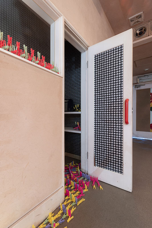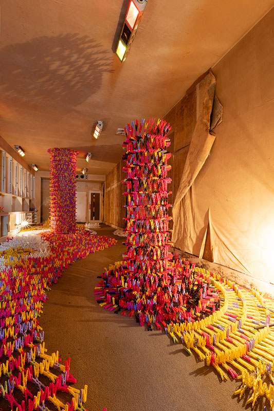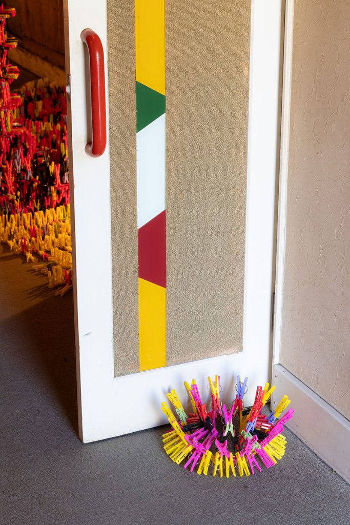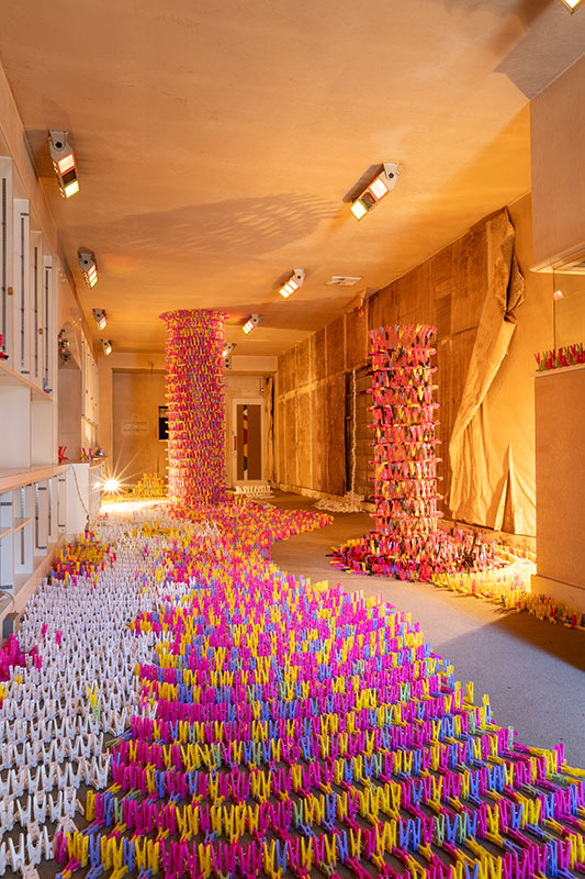Clothespins symbolize bodily knowledge in everyday life. They are a collection of countless human movements and hand movements that powerfully support human life, without being put into words. Each one has the visible shape of a clothespin, but when they are put together they show patterns, or free shapes, and when you change your perspective they can appear in many different ways. The total number of clothespins is 36,079, which is the current population of Ibara City.