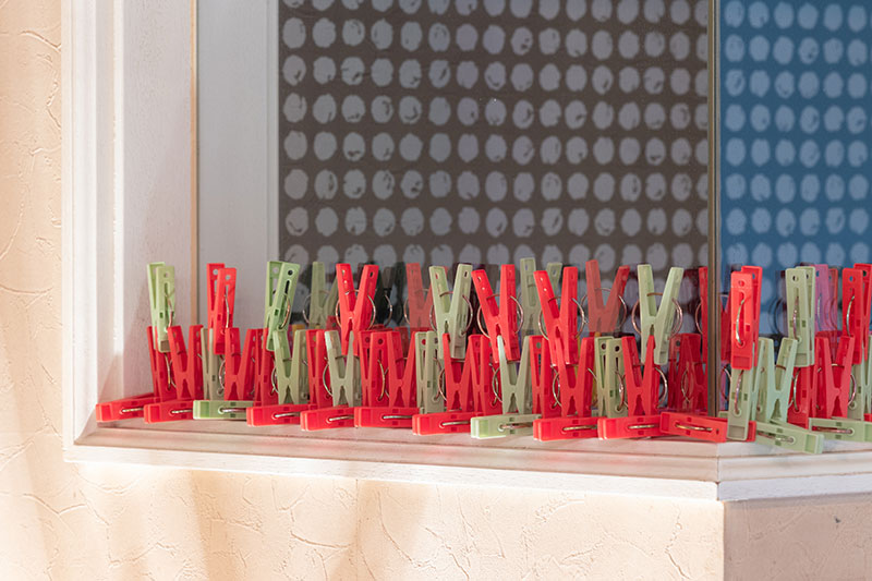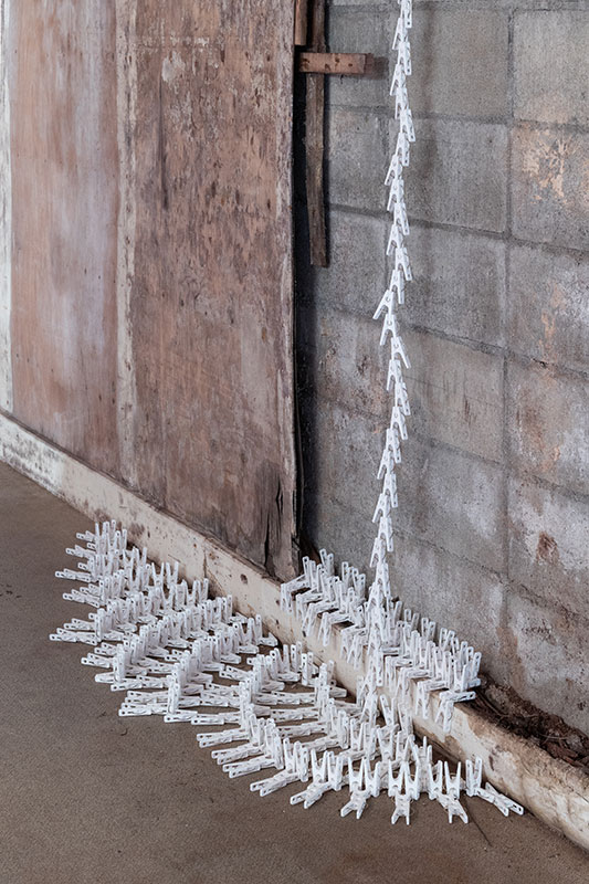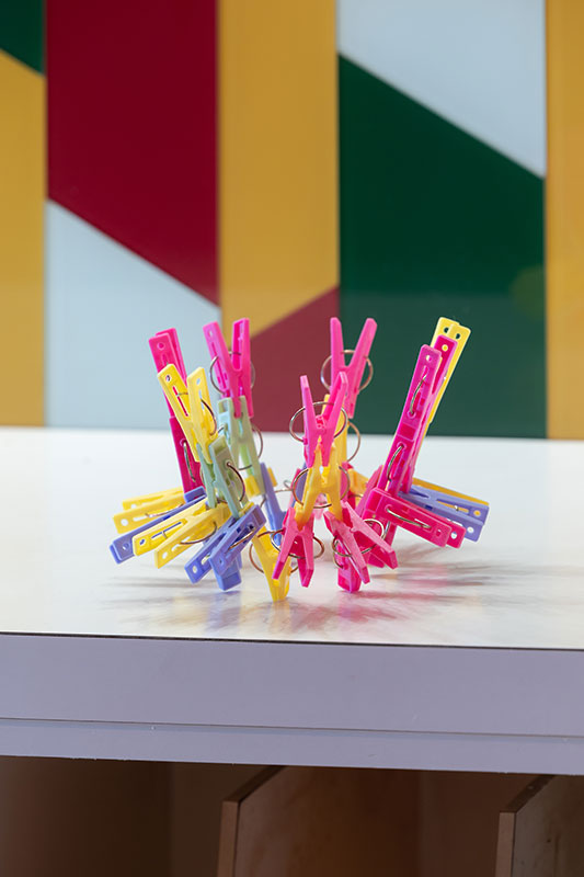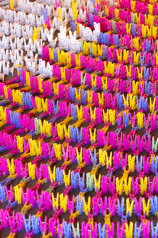 一つ一つは洗濯バサミという目に見える形をとっていますが、合わさると規則性が見えたり、自由な形が見えたり、視点を変えるとさまざまに見えてきます。
